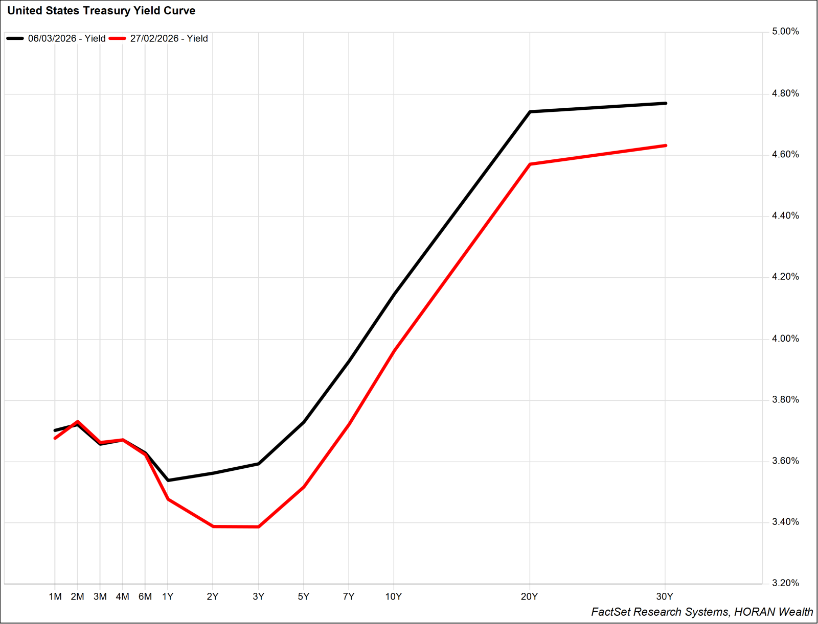 Despite the bump, this could cause CPI to report higher than expected for the next several reporting periods. FOMC rate cut probabilities have moved slightly lower since the initial strikes and US Treasury rates have moved higher. Below highlights last week’s shift in US Treasury yields: