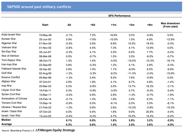 While markets in the near-term have sold off, an analysis of historical conflicts would suggest that markets could rally after an initial drawdown. We have discussed this at length in a recent post. Below is a chart from JPMorgan that highlights this relationship: